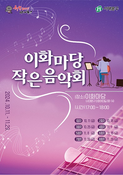 서대문구가 10월 11일부터 11월 29일까지 매주 금요일 오후 5∼6시 이화마당(이화여대길 88-14)에서 총 8회에 걸쳐 ‘작은 음악회’를 개최한다.
